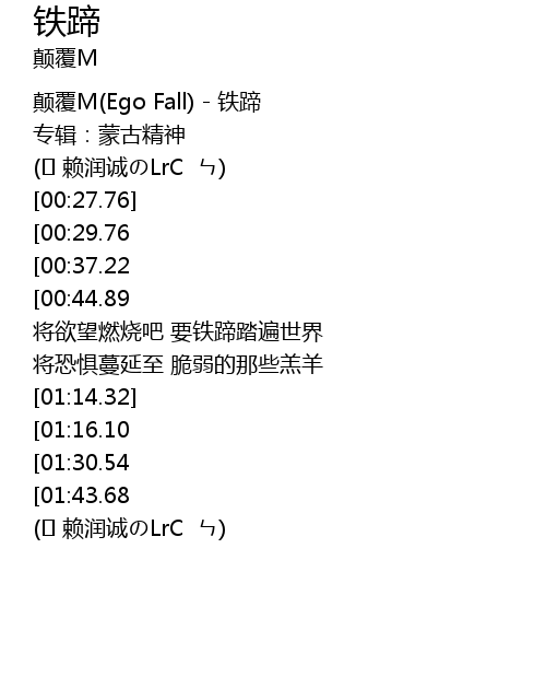 | [00:00.76] | 颠覆M(Ego Fall) - 铁蹄 |