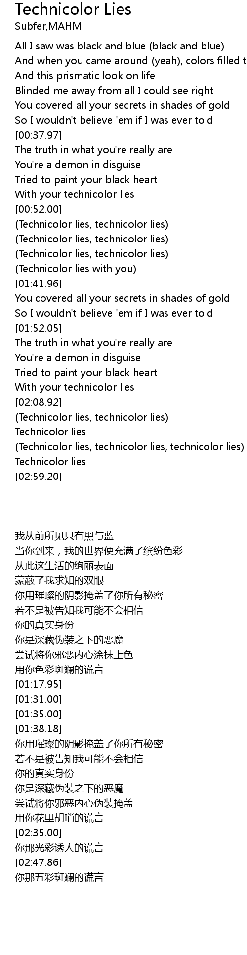 | [01:17.95] | (Technicolor lies, technicolor lies) |