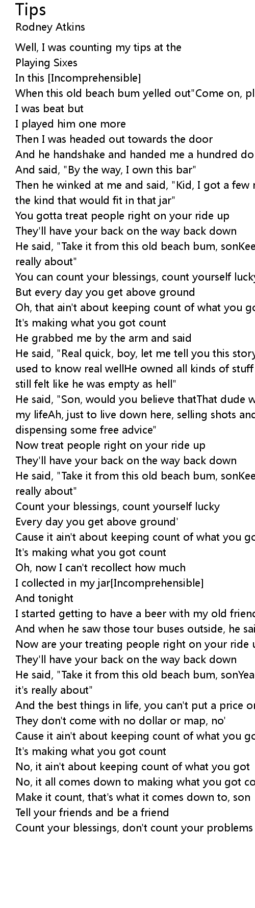 Then he winked at me and said, "Kid, I got a few more tipsBut they sure ain't the kind that would fit in that jar" |