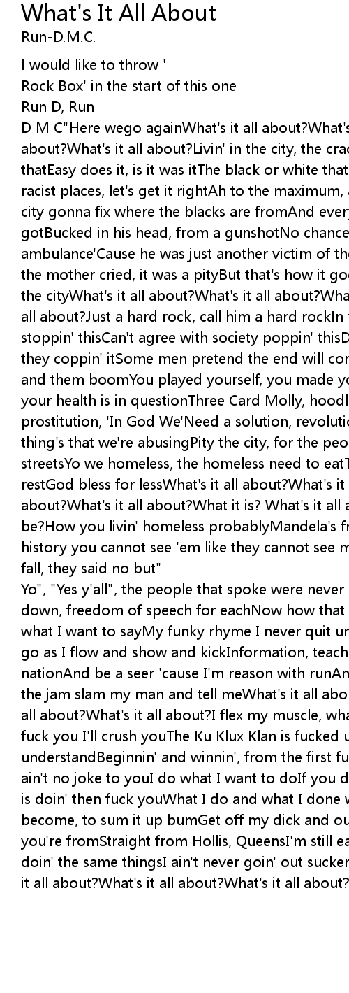 Yo", "Yes y'all", the people that spoke were never provokedAnd now it's tumblin' down, freedom of speech for eachNow how that sound?Try to stop me from sayin' what I want to sayMy funky rhyme I never quit until the break of dayNow here we go as I flow and show and kickInformation, teach and blessing reach inside the nationAnd be a seer 'cause I'm reason with runAnd now that the point is outLet the jam slam my man and tell meWhat's it all about?What's it all about?What's it all about?What's it all about?I flex my muscle, what I must doIs bum rush you, fuck you I'll crush youThe Ku Klux Klan is fucked upAnd every good man'll understandBeginnin' and winnin', from the first fuckin' vocalI spoke to you, I ain't no joke to youI do what I want to doIf you don't like what me and my crew is doin' then fuck youWhat I do and what I done with Jay and RunNone could ever become, to sum it up bumGet off my dick and out my kingdomYo yo D tell 'em where you're fromStraight from Hollis, QueensI'm still eatin' collard greens and I'm doin' the same thingsI ain't never goin' out suckers, punk motherfuckersWhat's it all about?What's it all about?What's it all about?What's it all about?... |