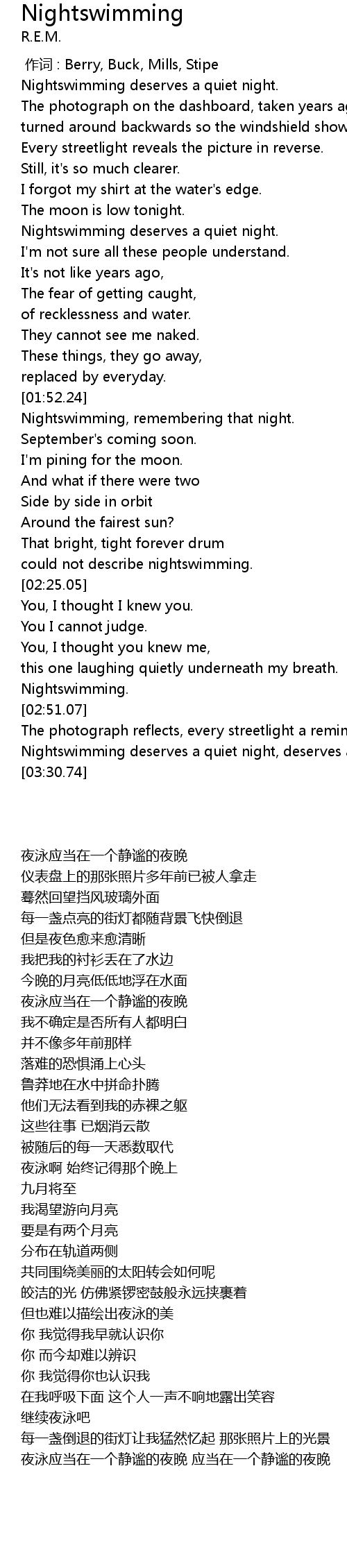 | [03:23.66] | Nightswimming deserves a quiet night, deserves a quiet night. |
