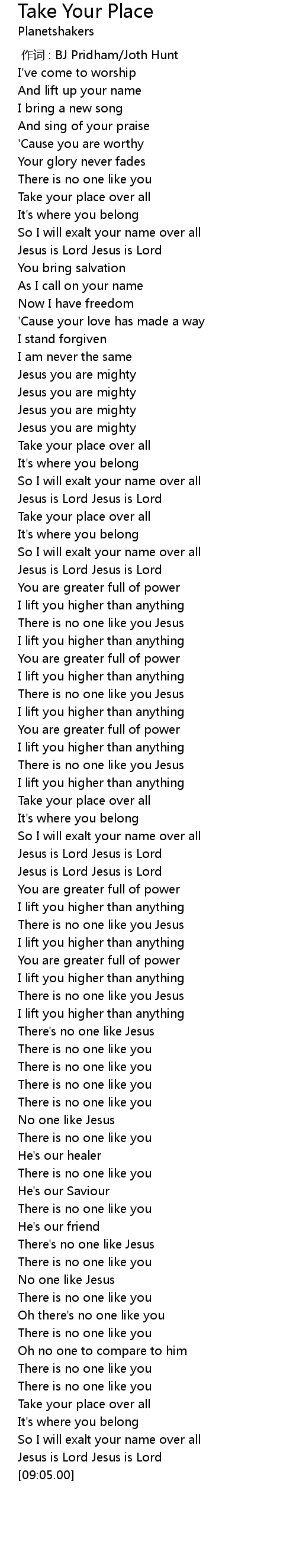 | [05:16.44] | There is no one like you Jesus |
