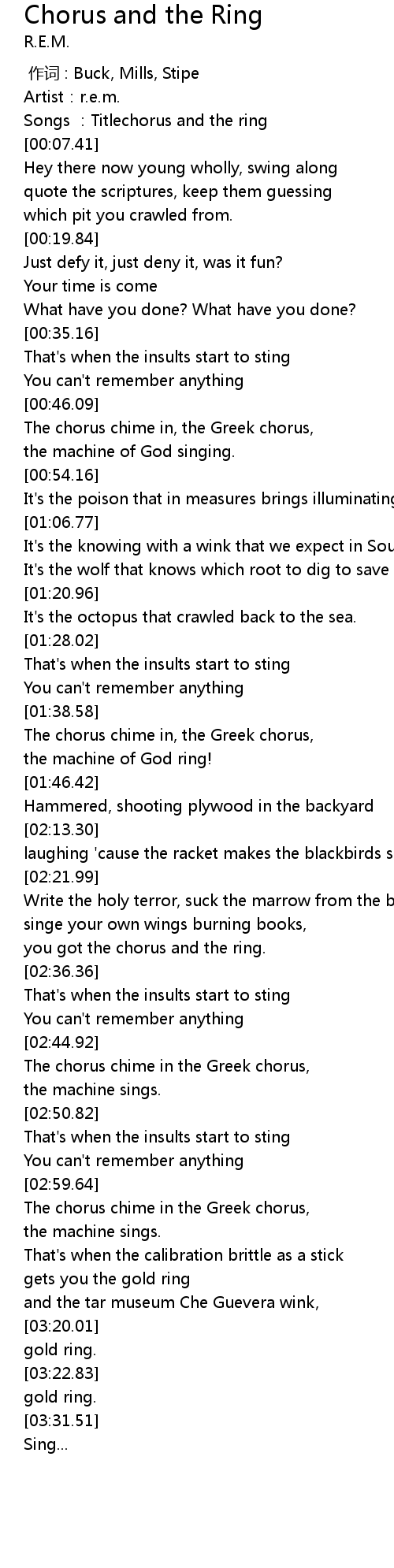 | [00:46.72] | The chorus chime in, the Greek chorus, |