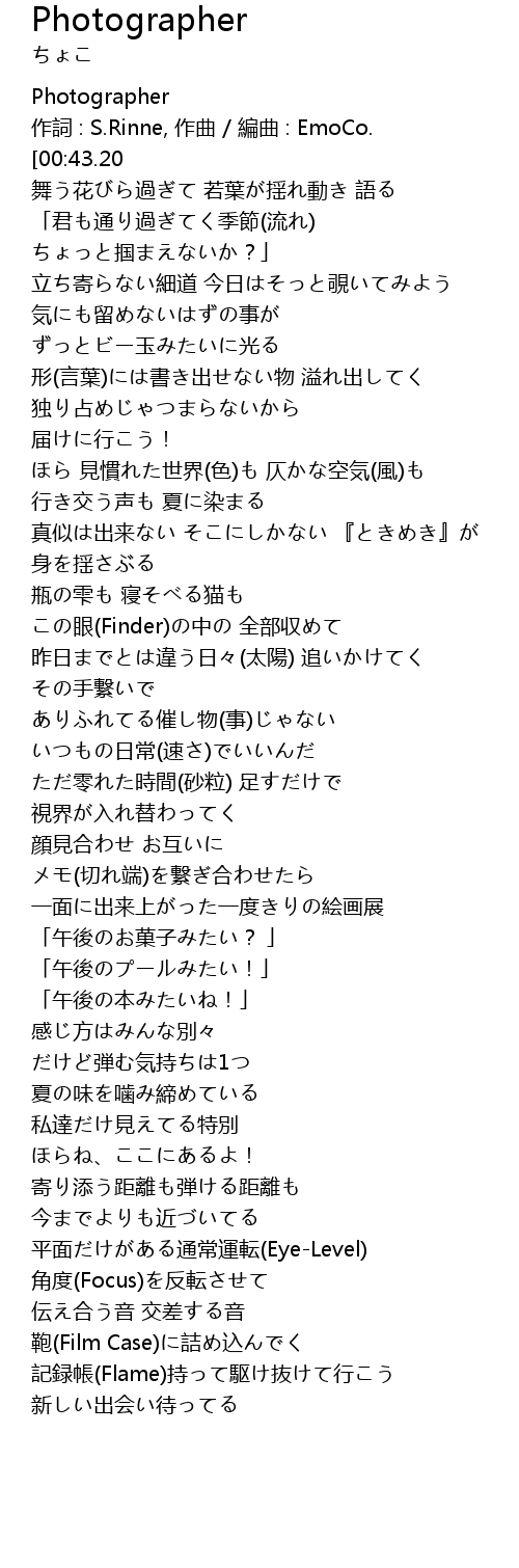 | [00:06.16] | 作詞 : S.Rinne, 作曲 / 編曲 : EmoCo. |