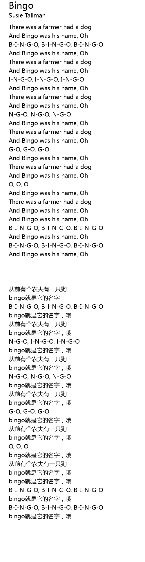 B-I-N-G-O, B-I-N-G-O, B-I-N-G-O |