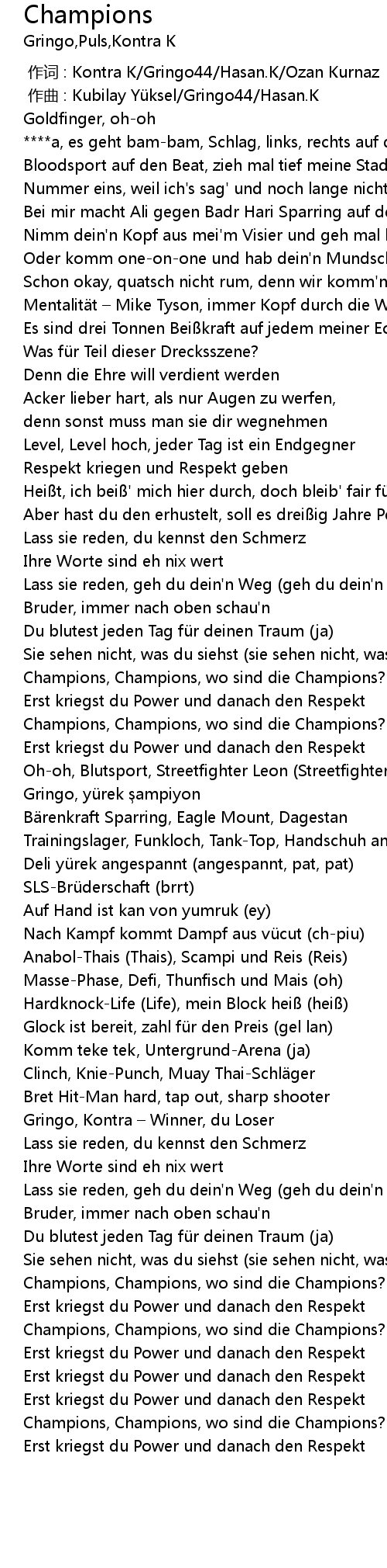 | [02:36.77] | Champions, Champions, wo sind die Champions? |