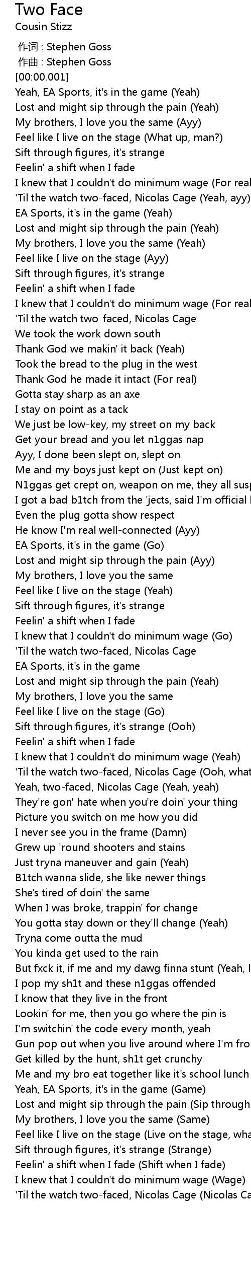 | [01:35.940] | Yeah, two-faced, Nicolas Cage (Yeah, yeah) |