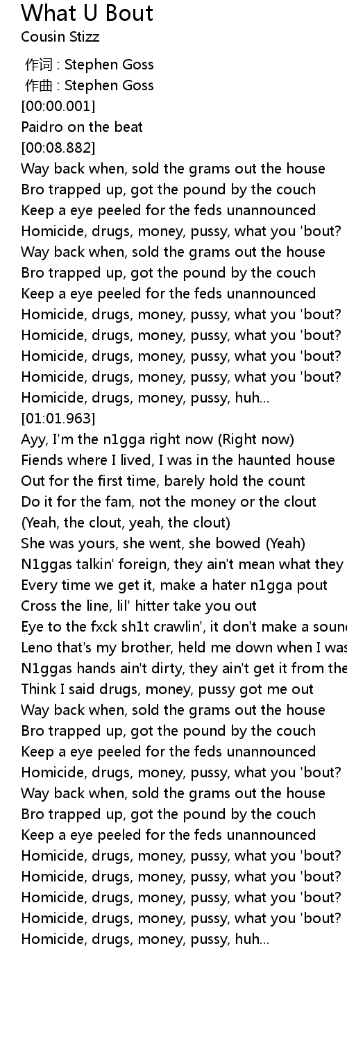 | [00:56.011] | Homicide, drugs, money, pussy, what you 'bout? (What you 'bout?) |