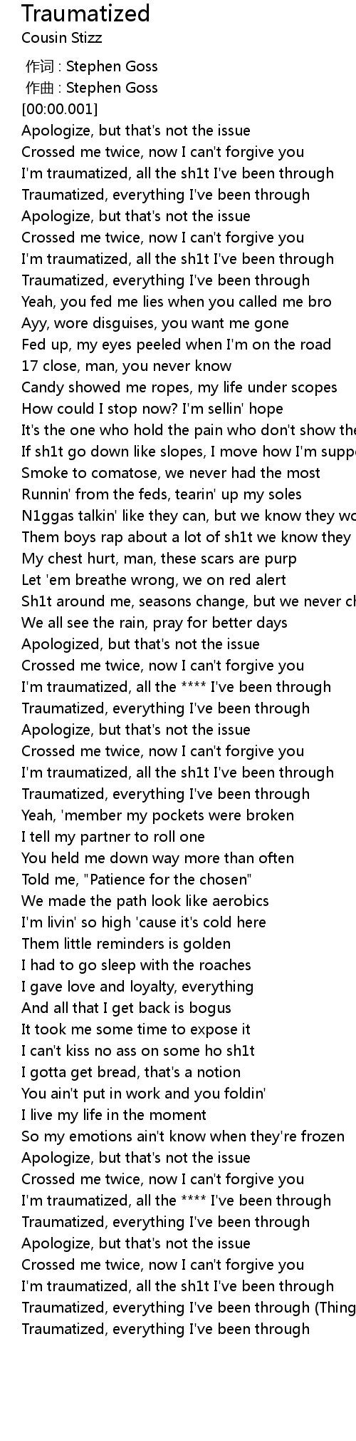 | [00:38.535] | I'm traumatized, all the sh1t I've been through |