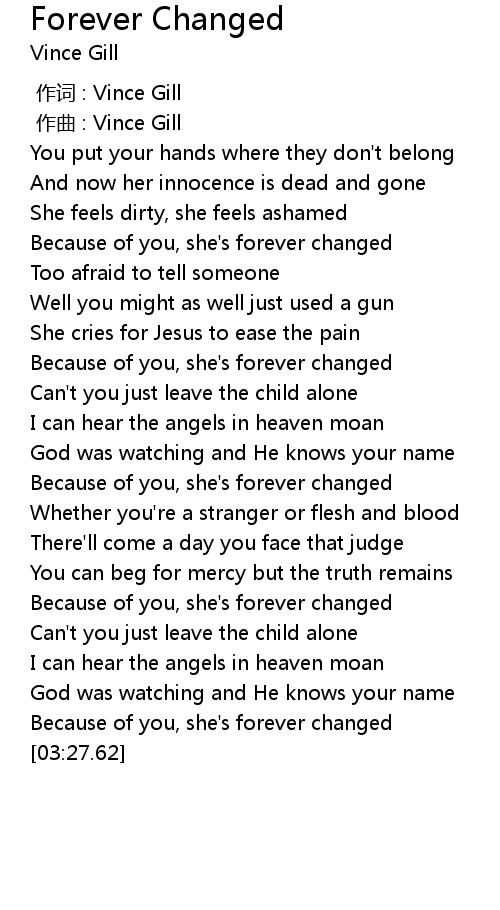 | [03:19.93] | Because of you, she' s forever changed |