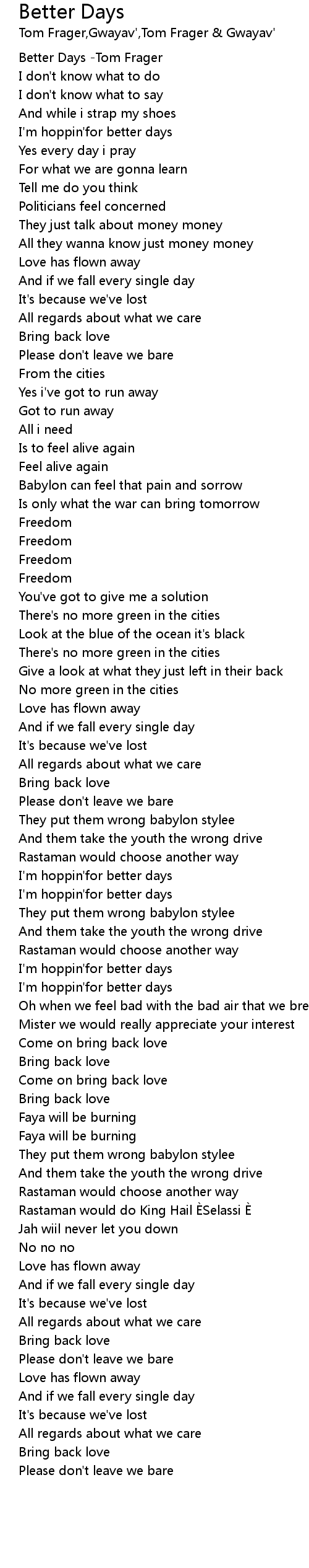 | [00:00.390] | Better Days -Tom Frager |