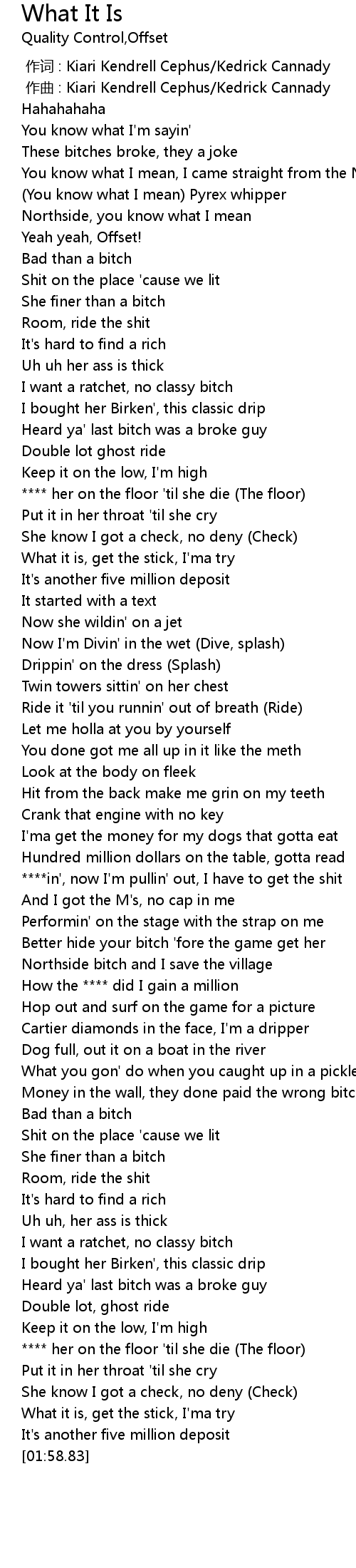 | [01:26.34] | Money in the wall, they done paid the wrong bitch(offset) |