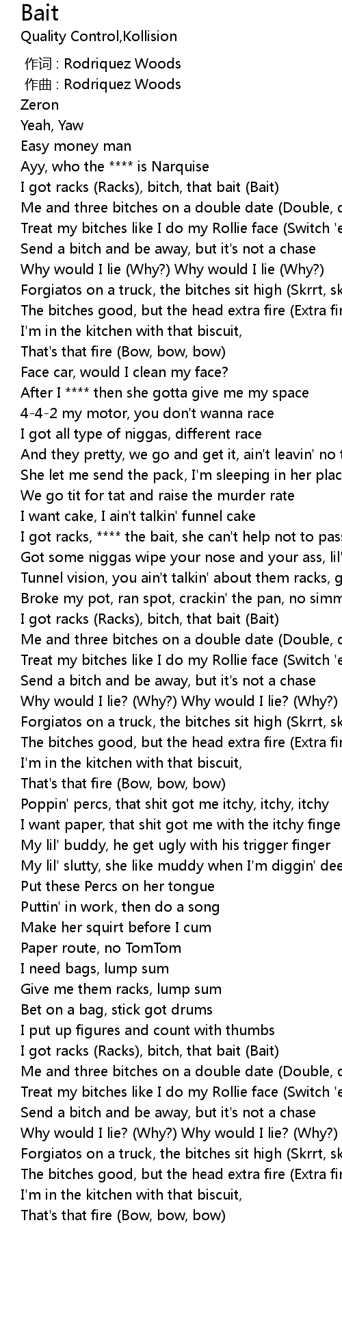 | [01:55.67] | I got racks Racks, bitch, that bait Bait |