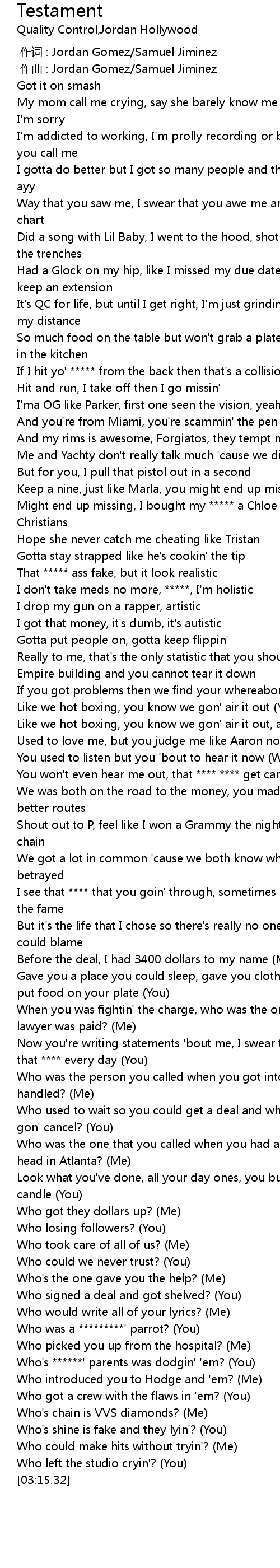 | [02:57.80] | Who's ******' parents was dodgin' 'em? (You) |