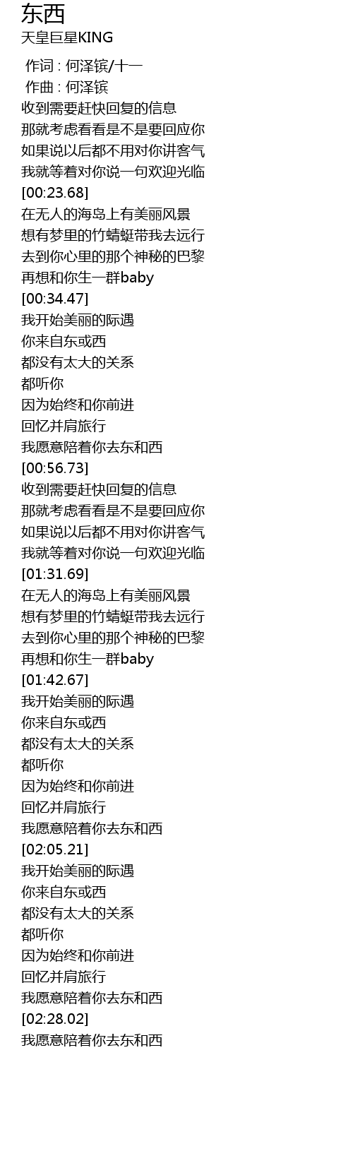 | [02:29.30] | 我愿意陪着你去东和西 |