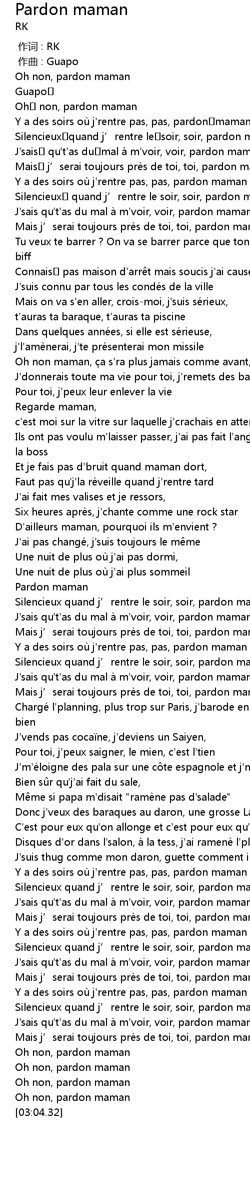 | [00:31.45] | J' sais qu' t' as du mal à m' voir, voir, pardon maman |