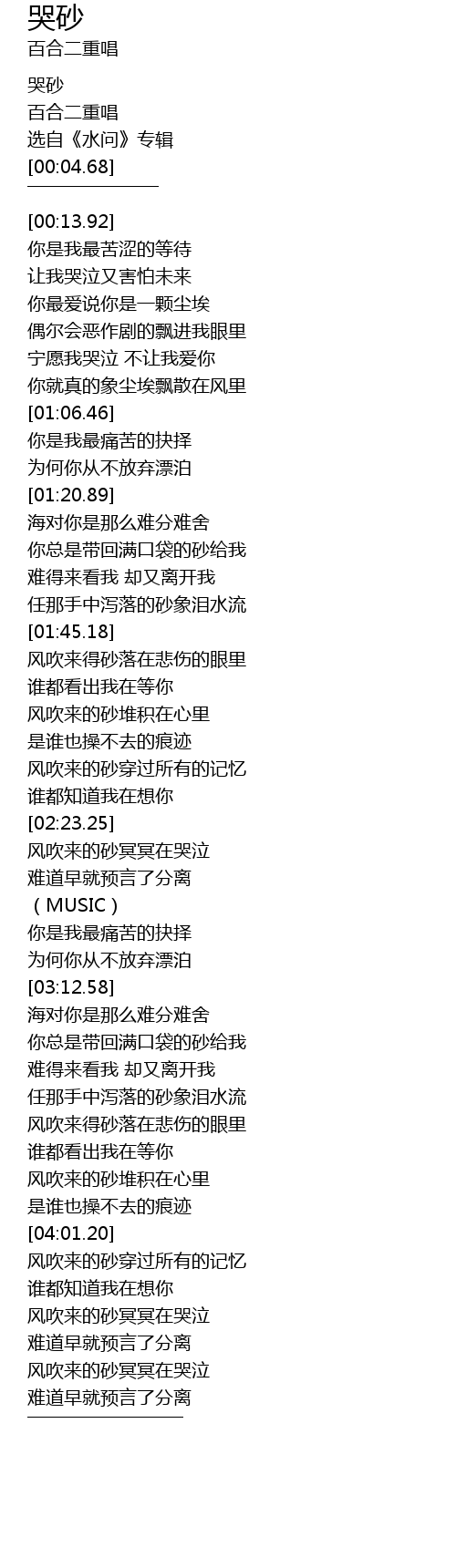 | [01:47.49] | 风吹来得砂落在悲伤的眼里 |