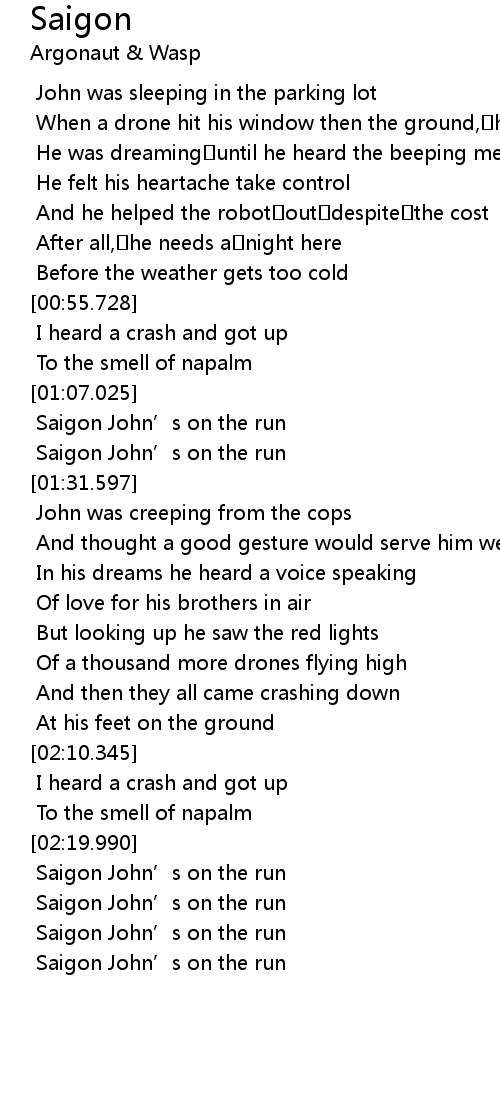 | [01:19.628] | Saigon John’s on the run |