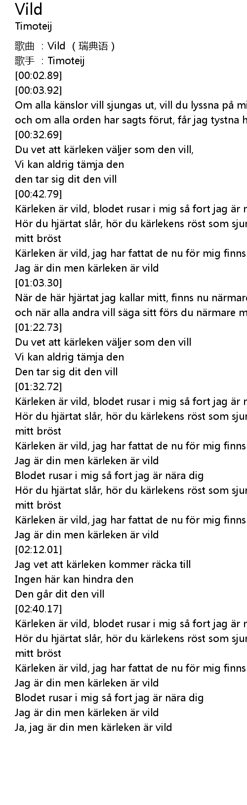 | [02:43.30] | Kärleken är vild, blodet rusar i mig så fort jag är nära dig |