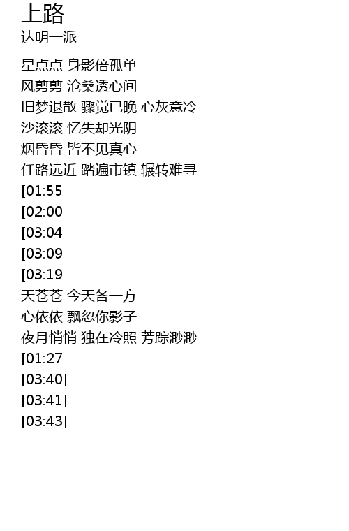 | [00:43] | 任路远近 踏遍市镇 辗转难寻 |