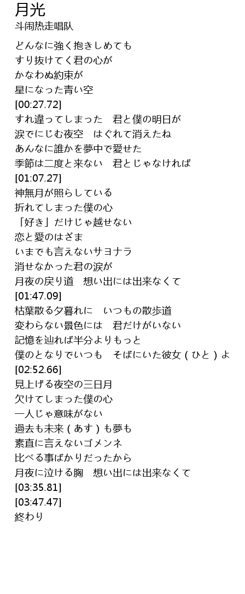 | [01:33.41] | 月夜の戻り道 想い出には出来なくて |