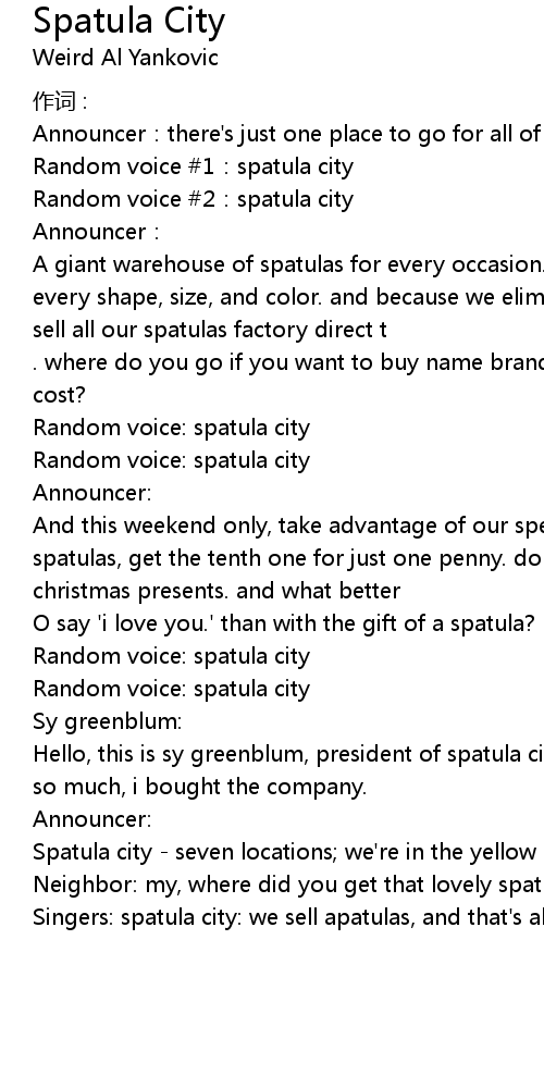 | Singers: spatula city: we sell apatulas, and that' s all |