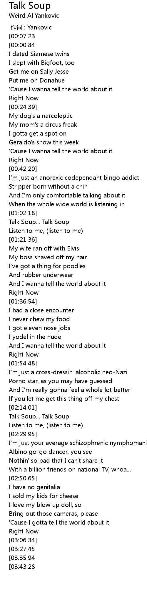 | [03:45.18][03:27.45][03:09.48] | Talk Soup... Talk Soup |