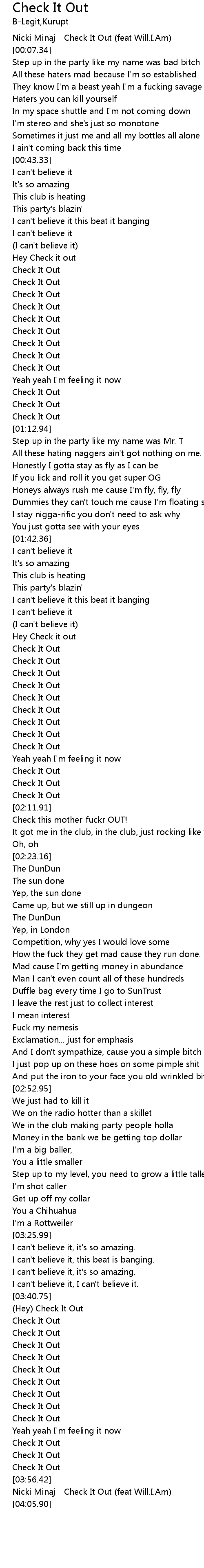 | [00:03.60] | Nicki Minaj - Check It Out (feat Will.I.Am) |