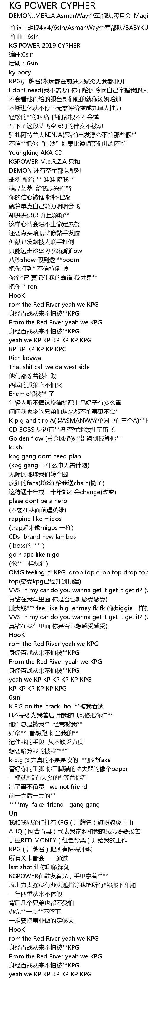 | [00:22.699] | KPG(厂牌名)永远都在前进天赋努力我都兼并 |