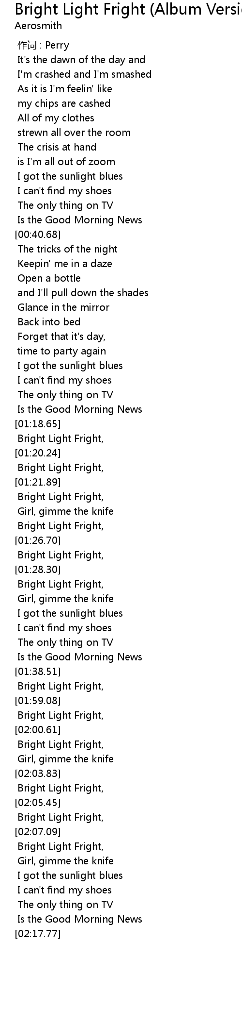 | [02:01.03] | Bright Light Fright, |