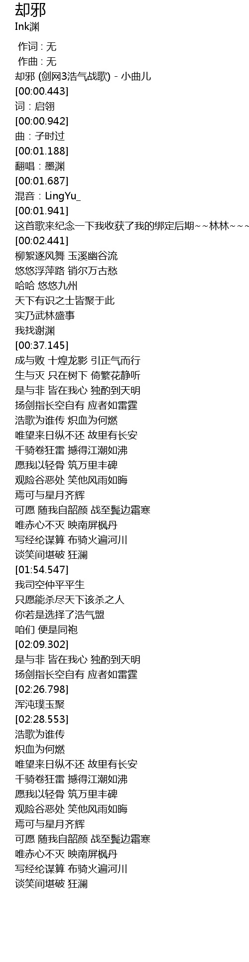 | [00:00.443] | 却邪 (剑网3浩气战歌) - 小曲儿 |