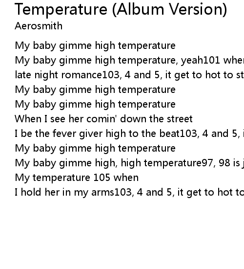 My baby gimme high temperature, yeah101 when we kiss and dance102 honey for a late night romance103, 4 and 5, it get to hot to stay alive |