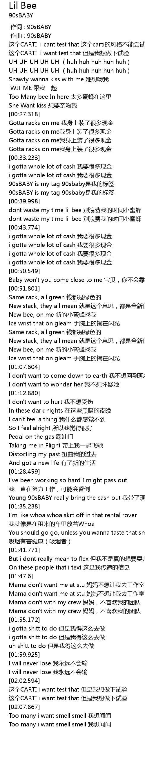 | [00:41.015] | dont waste my time lil bee 别浪费我的时间小蜜蜂 |