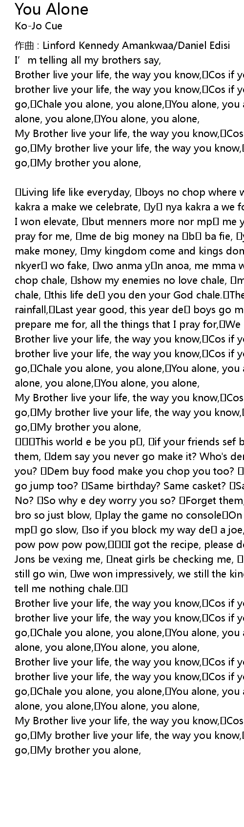 | Brother live your life, the way you know, Cos if you die, you pɛ go go, My brother live your life, the way you know, Cos if you die, you pɛ go go, Chale you alone, you alone, You alone, you alone, I swear say you alone, you alone, You alone, you alone, | |