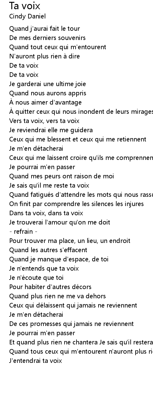 | Et quand plus rien ne chantera Je sais qu' il restera ta voix | |
