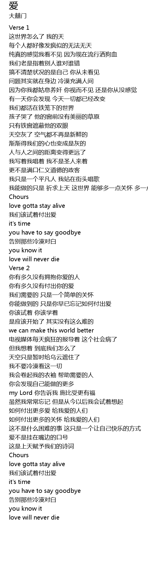 | 我能做的只是 祈求上天 这世界 能够多一点关怀 多一点爱 | |