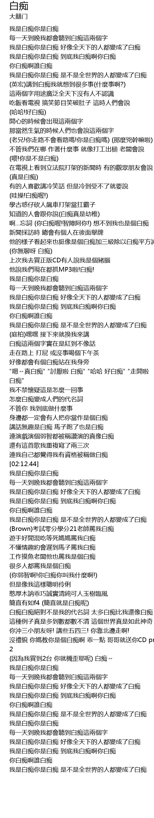 | [01:32.43] | 我是白痴你是白痴 到底我白痴啊你白痴 你白痴啊誰白痴 |
