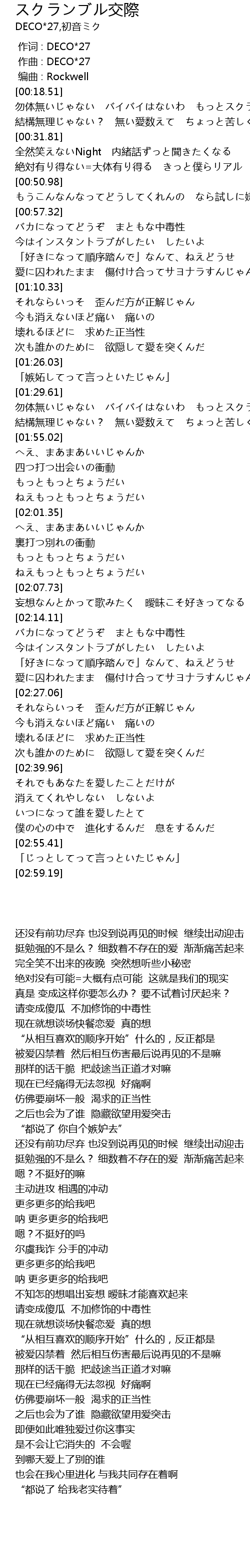 | [00:19.32] | 勿体無いじゃない バイバイはないわ もっとスクランブル |