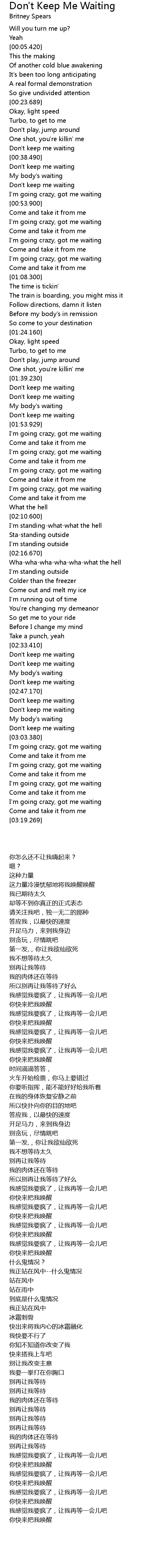 | [02:51.880] | Don' t keep me waiting |