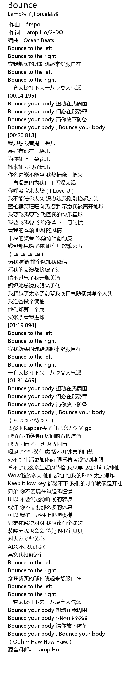 | [01:37.758] | Bounce your body qing ni fang xia fang bei |