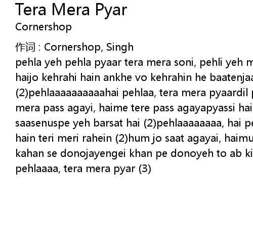 | pehla yeh pehla pyaar tera mera soni, pehli yeh mulakat haipehli yeh mula kat haijo kehrahi hain ankhe vo kehrahin he baatenjaagi tu bhi saari rat hai 2 pehlaaaaaaaaaahai pehlaa, tera mera pyaardil pe chalana jub zor koi 2 tu mera pass agayi, haime tere pass agayapyassi hai teri saasenpyassi hai meri saasenuspe yeh barsat hai 2 pehlaaaaaaaa, hai pehla, tera mera pyaarruk si gayi hain teri meri rahein 2 hum jo saat agayai, haimunzil ke pass agayaiaye thay kahan se donojayengei khan pe donoyeh to ab kise yaad hai 2 pehlaaaaaaaaaa, hai pehlaaaa, tera mera pyar 3 |