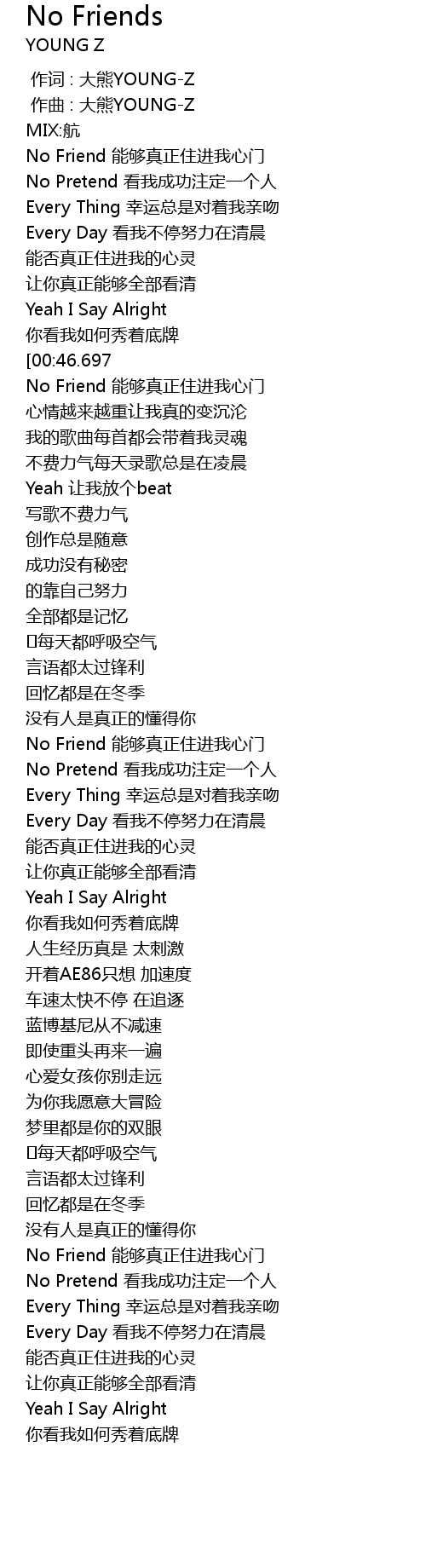 | [00:47.697] | No Friend néng gòu zhēn zhèng zhù jìn wǒ xīn mén |