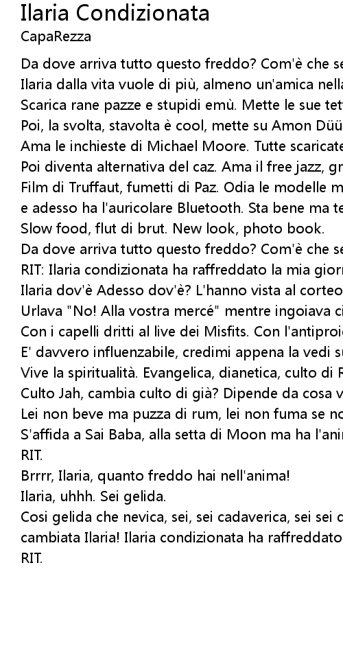 | Cosi gelida che nevica, sei, sei cadaverica, sei sei di facciata ghiacciata, sei cambiata Ilaria! Ilaria condizionata ha raffreddato la mia giornata. | |