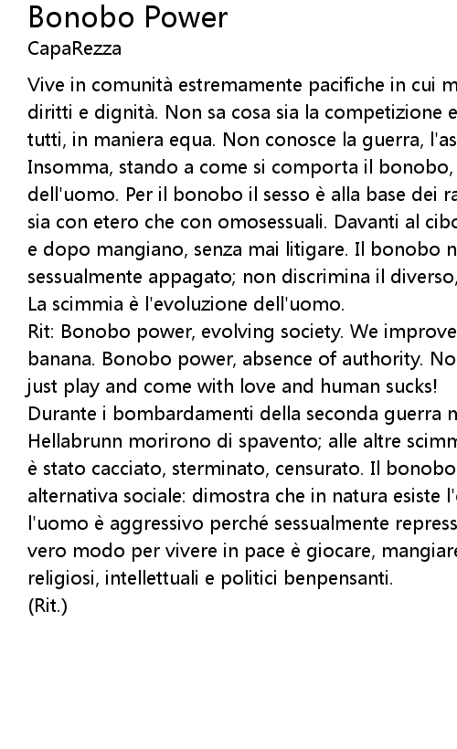 | Rit: Bonobo power, evolving society. We improve the community and human eat the banana. Bonobo power, absence of authority. No more cruelty, no more war. We just play and come with love and human sucks! | |