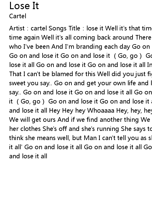 | [00:01.48] | Artist:cartel Songs Title:lose it Well it's that time It's that time again Well it's all coming back around There she sees me Oh my god, this is who I've been And I'm branding each day Go on and lose it Go on and lose it all Go on and lose it Go on and lose it (Go, go) Go on and lose it Go on and lose it all Go on and lose it Go on and lose it all Immediately we find out then That I can't be blamed for this Well did you just figure out today And your so sweet you say.. Go on and get your own life and live it your way And I hear you say.. Go on and lose it Go on and lose it all Go on and lose it Go on and lose it (Go, go) Go on and lose it Go on and lose it all Go on and lose it Go on and lose it all Hey Hey hey Whoaaaa Hey, hey, hey And if we find another thing We will get ours And if we find another thing We will get ours She's picking up her clothes She's off and she's running She says to me 'Go on and lose it' I think she means well, but Man I can't tell you as she says to me 'Go on and lose it all' Go on and lose it all Go on and lose it all Go on and lose it all Go on and lose it all |