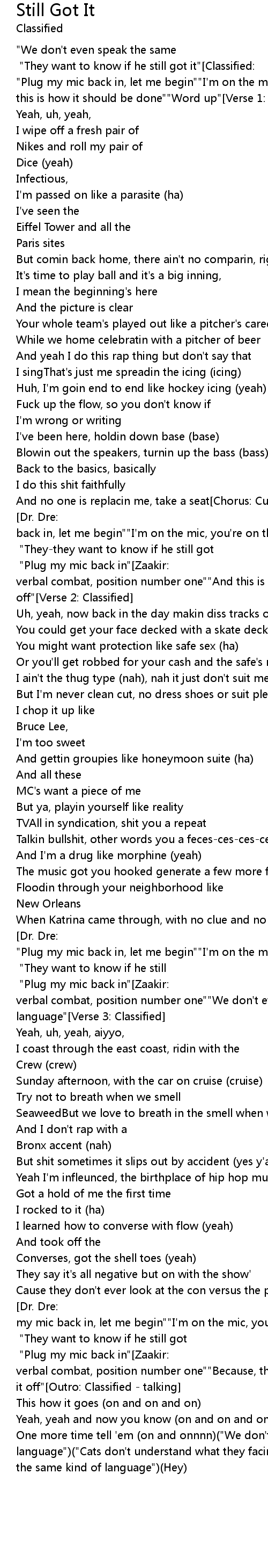 When Katrina came through, with no clue and no warning[Chorus: Cuts by DJ Jorun - w/ ad libs][Dr. Dre:] "They want to know if he still got it"[Classified:] "Plug my mic back in, let me begin""I'm on the mic, you're on the run""Because, this is how it should be done""Word up"[Dr. Dre:] "They want to know if he still got it"[Classified:] "Plug my mic back in"[Zaakir:] "The verbal-the verbal-the verbal combat, position number one""We don't even speak the same kind of language"[Verse 3: Classified] |