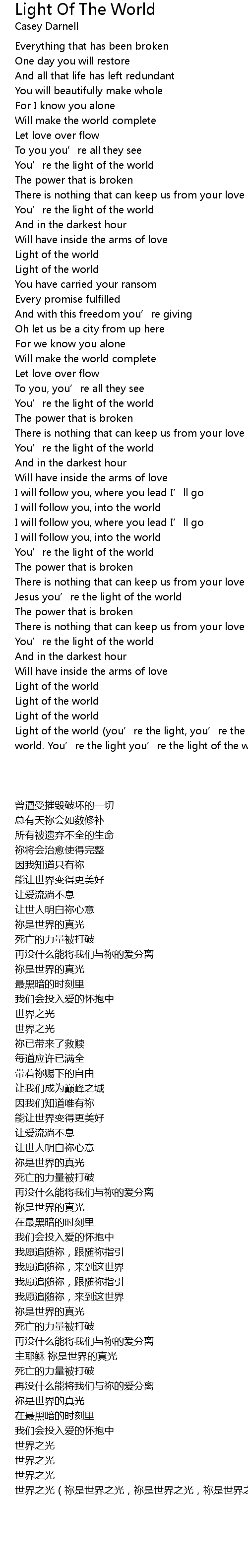 | [03:46.800] | Light of the world you' re the light, you' re the light of the world. You' re the light you' re the light of the world |