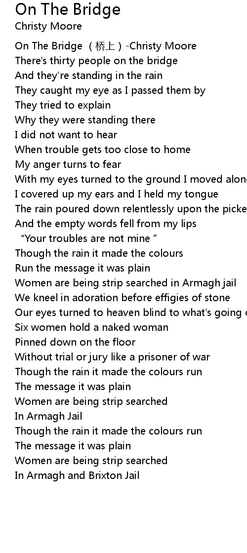 | [00:00.00] | On The Bridge (桥上)-Christy Moore |