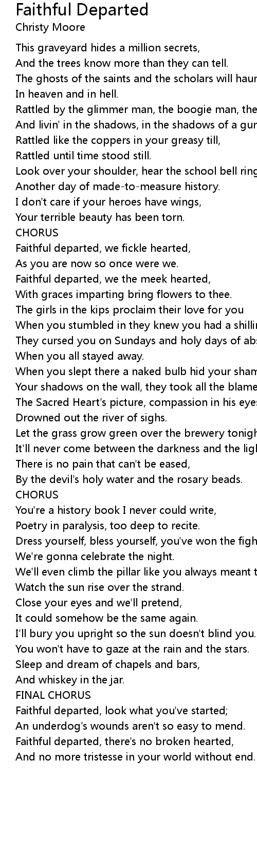 Faithful departed, there's no broken hearted, |
