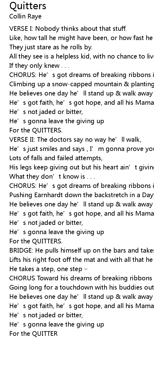 | CHORUS Toward his dreams of breaking ribbons in a hundred yard dash, | |
